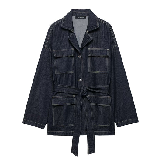 Coats: Polo Collar Belt Tooling Denim Coat
